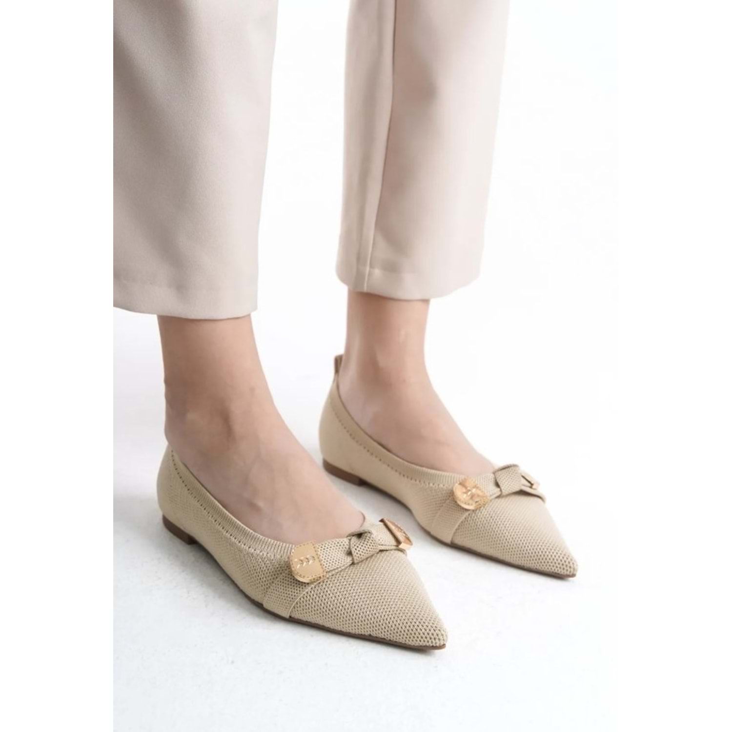 Feles Triko Fiyonk Detaylı Sivri Burun Kadın Babet Ayakkabı