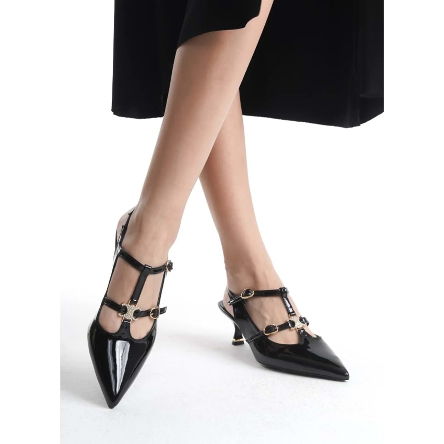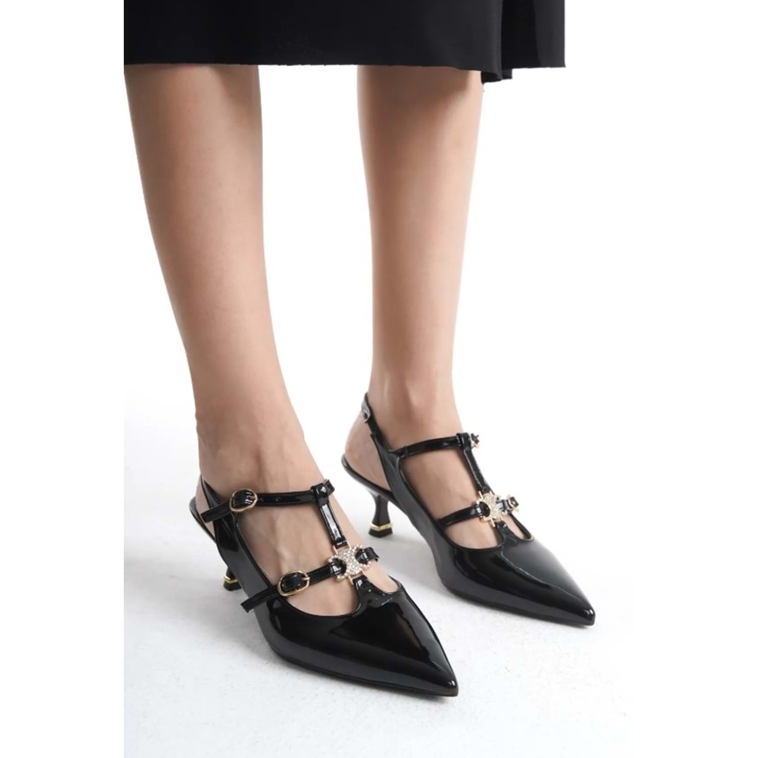 Feles Şeker Topuklu Çift Toka Detaylı Arkası Açık Stiletto Kadın Kısa Topuklu Ayakkabı
