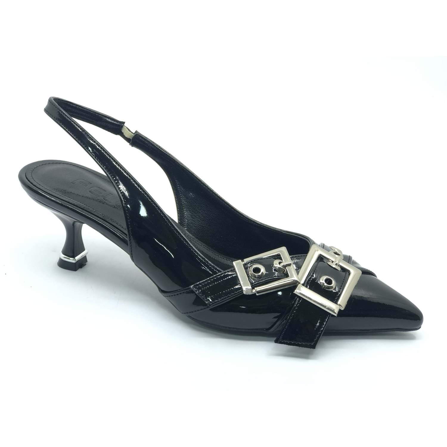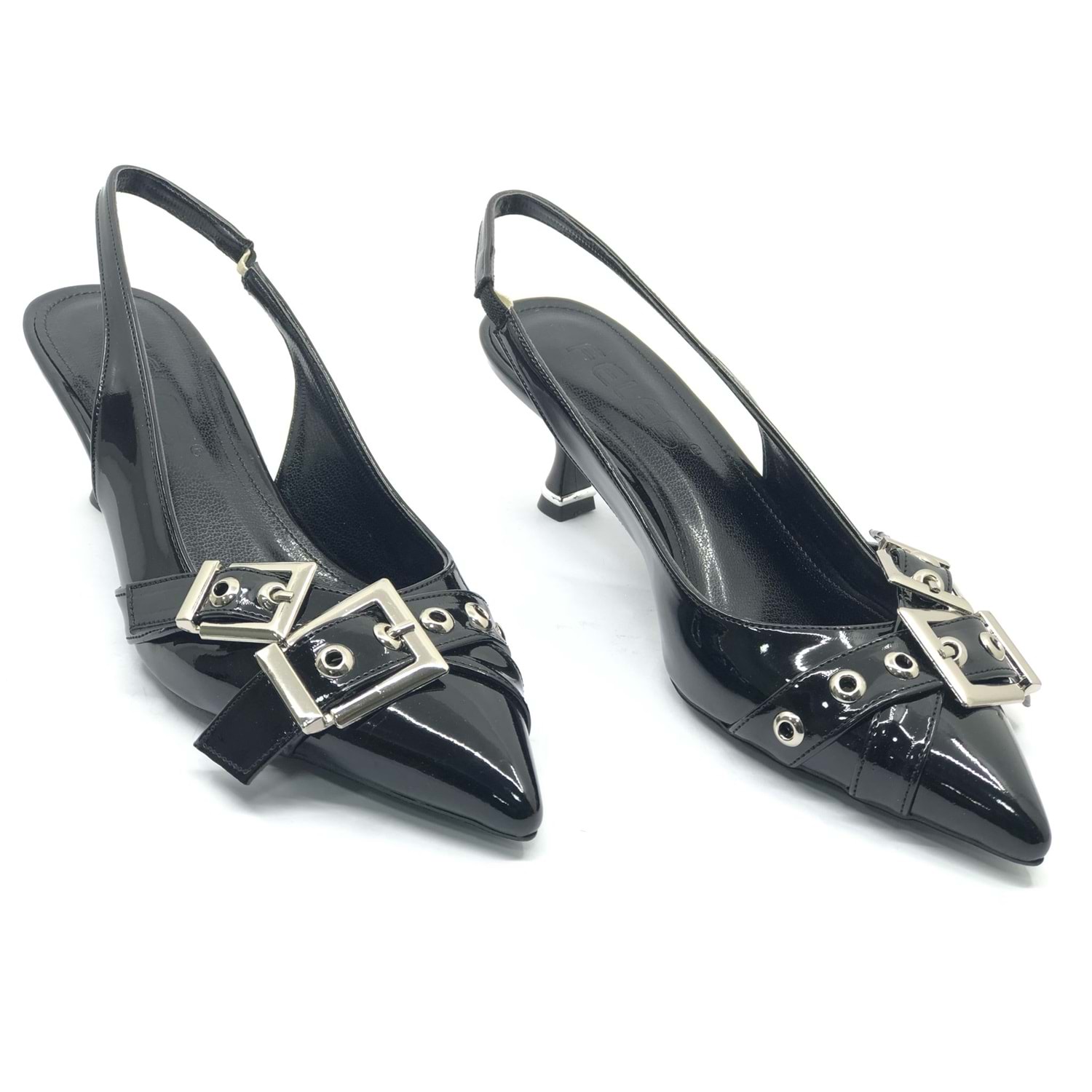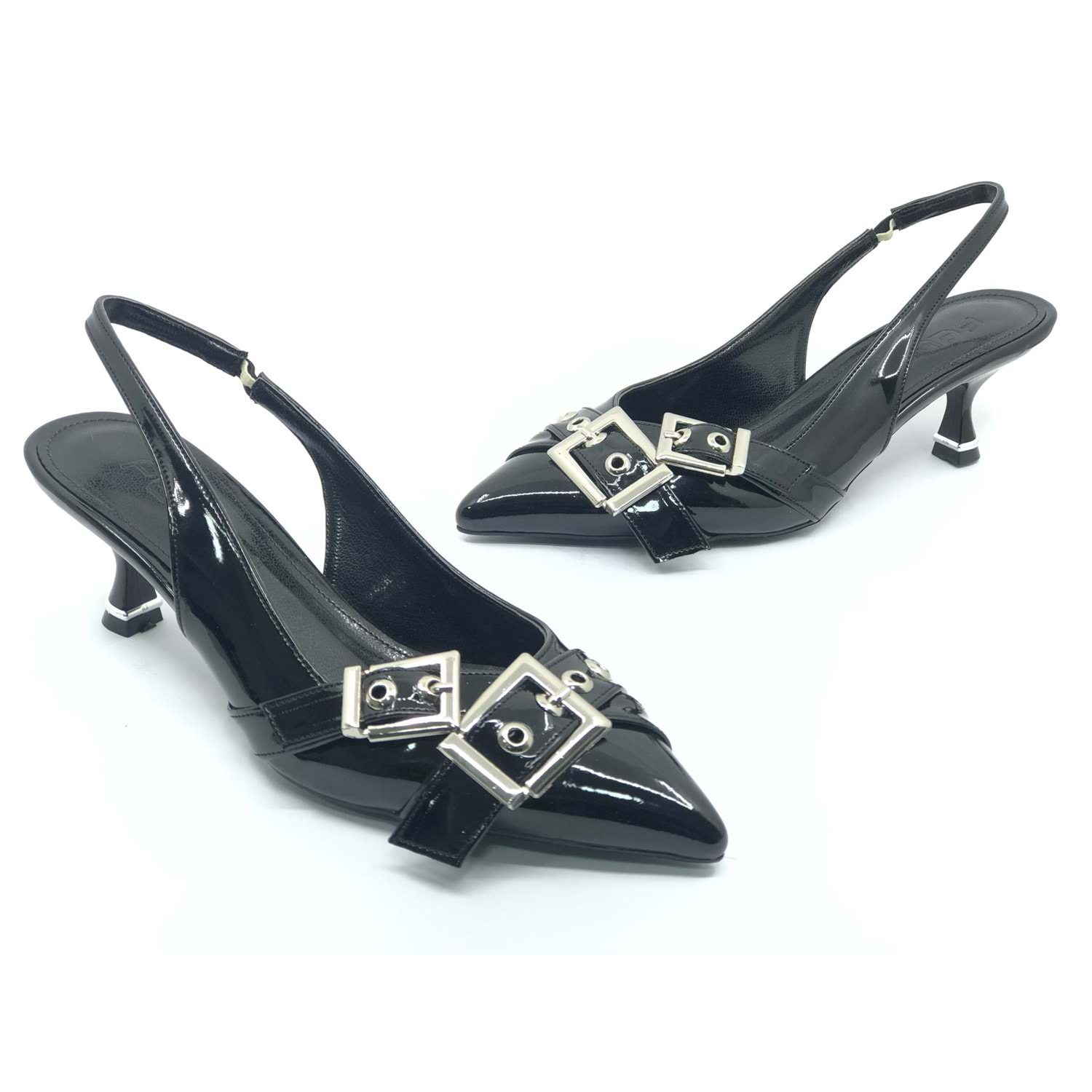 Feles Şeker Topuklu Çift Toka Detaylı Arkası Açık Stiletto Kadın Kısa Topuklu Ayakkabı
