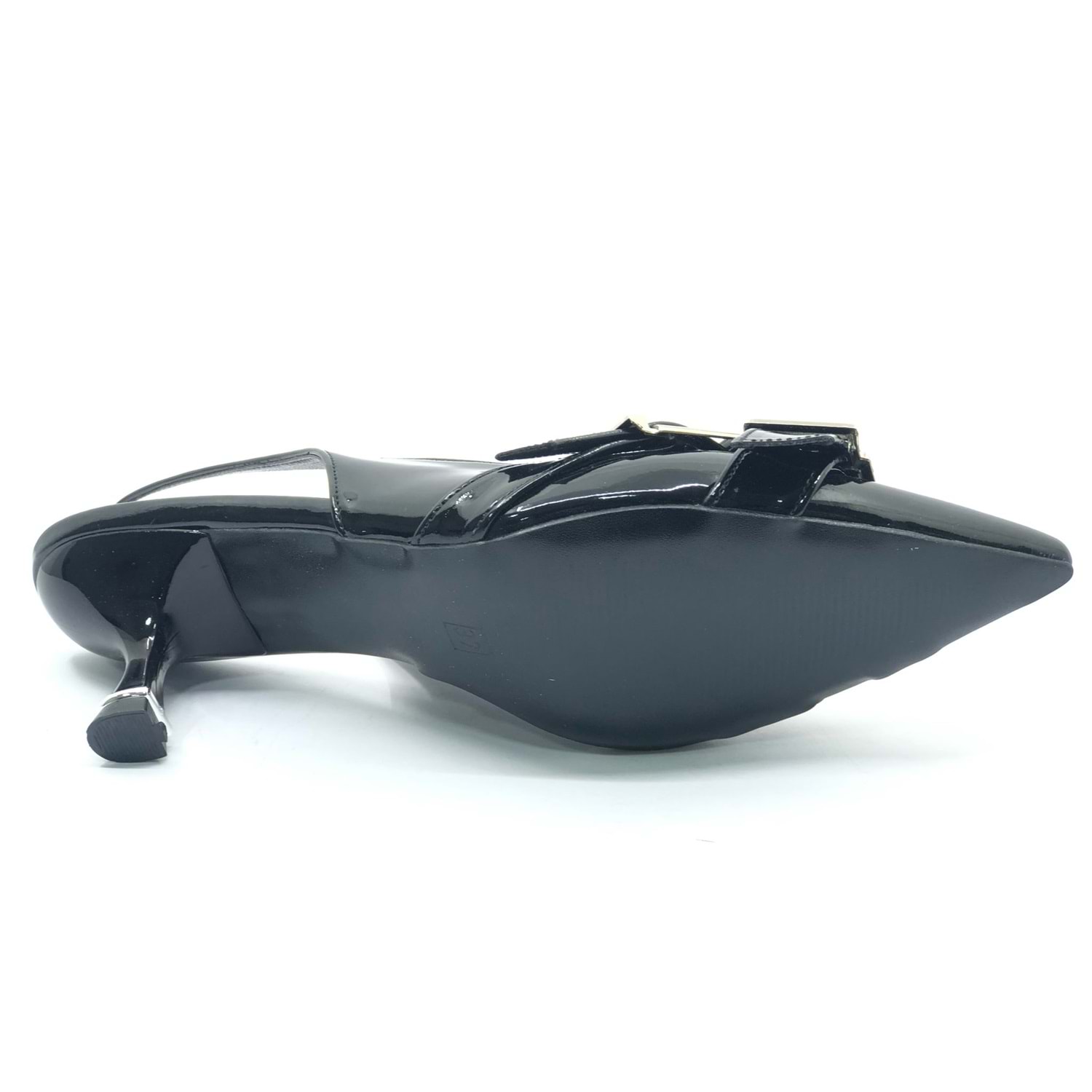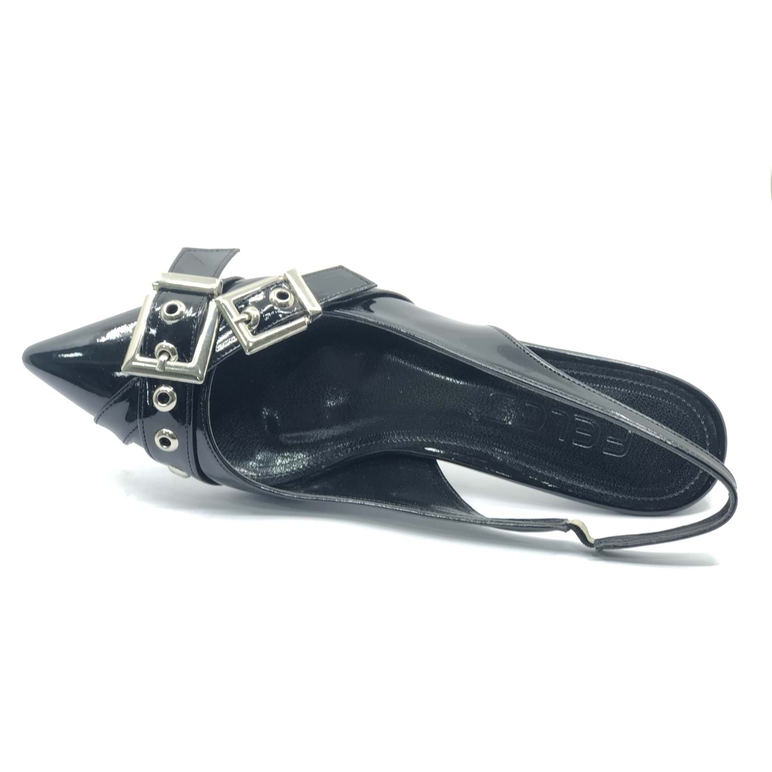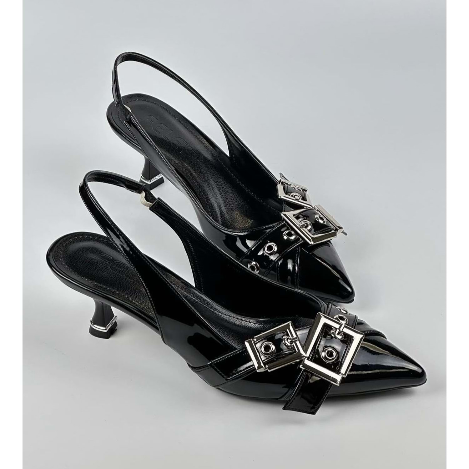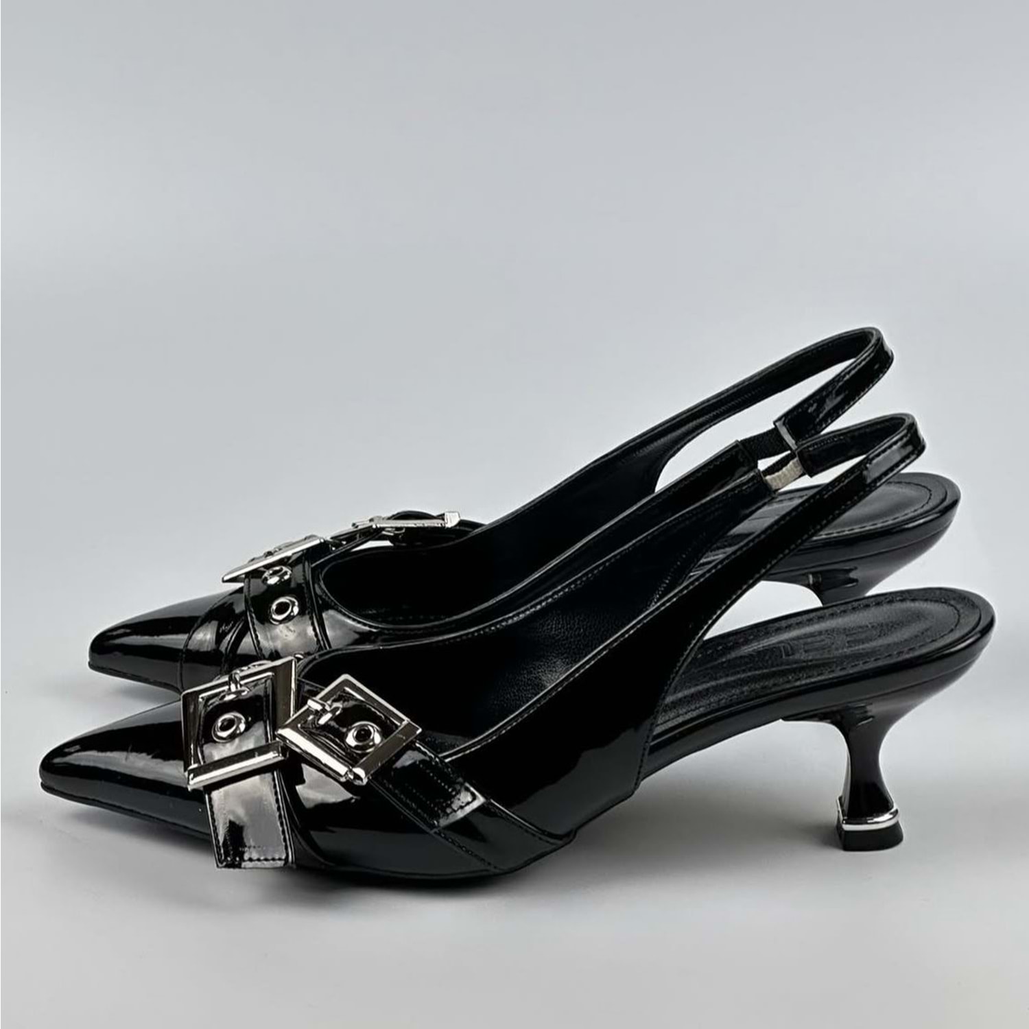 Feles Şeker Topuklu Çift Toka Detaylı Arkası Açık Stiletto Kadın Kısa Topuklu Ayakkabı