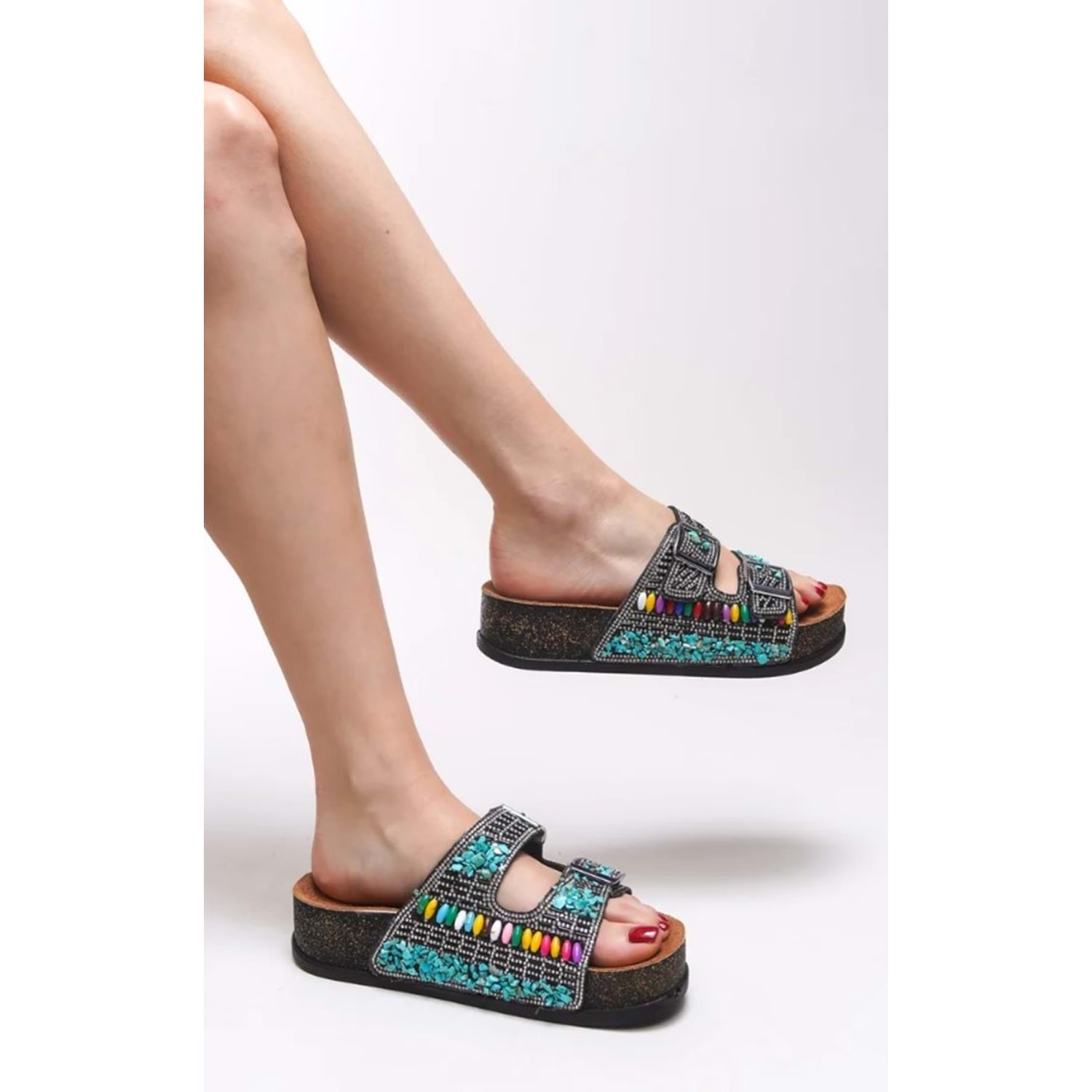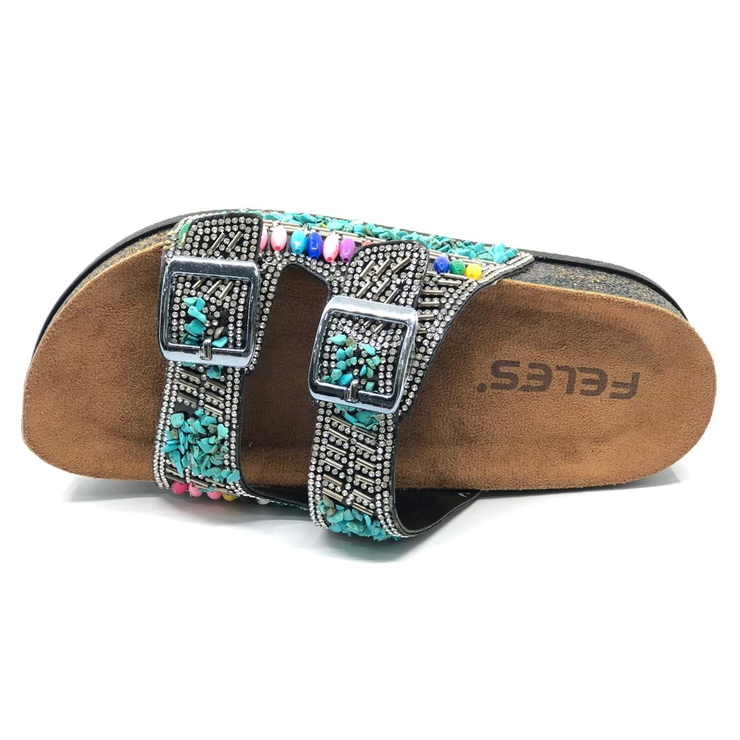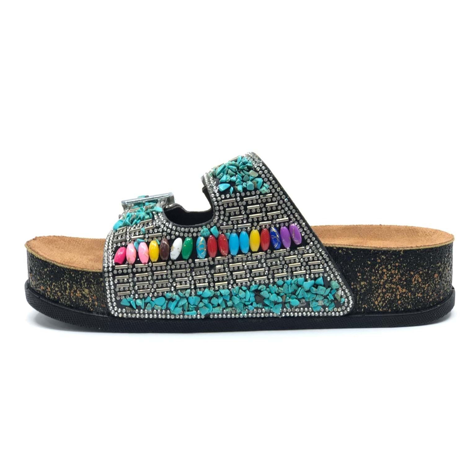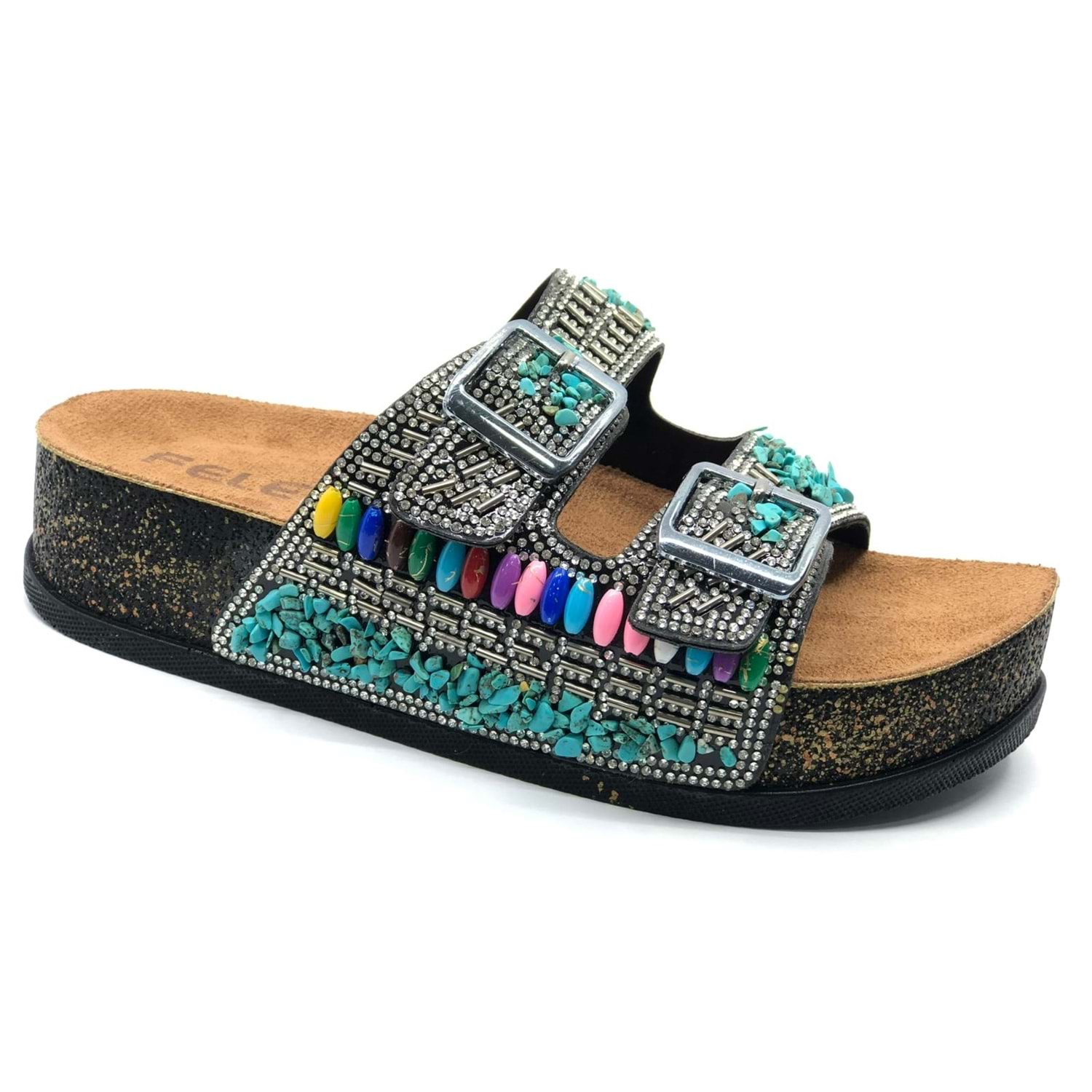 Feles Çift Toka Mantar Taban Taş Detaylı Kadın Terlik