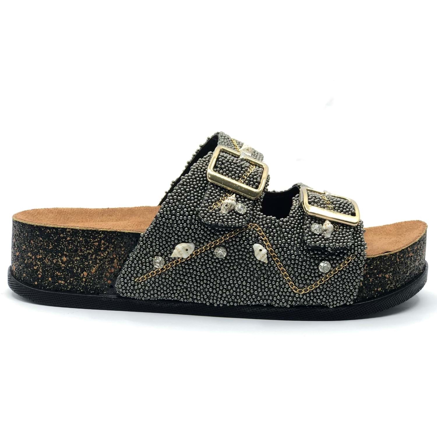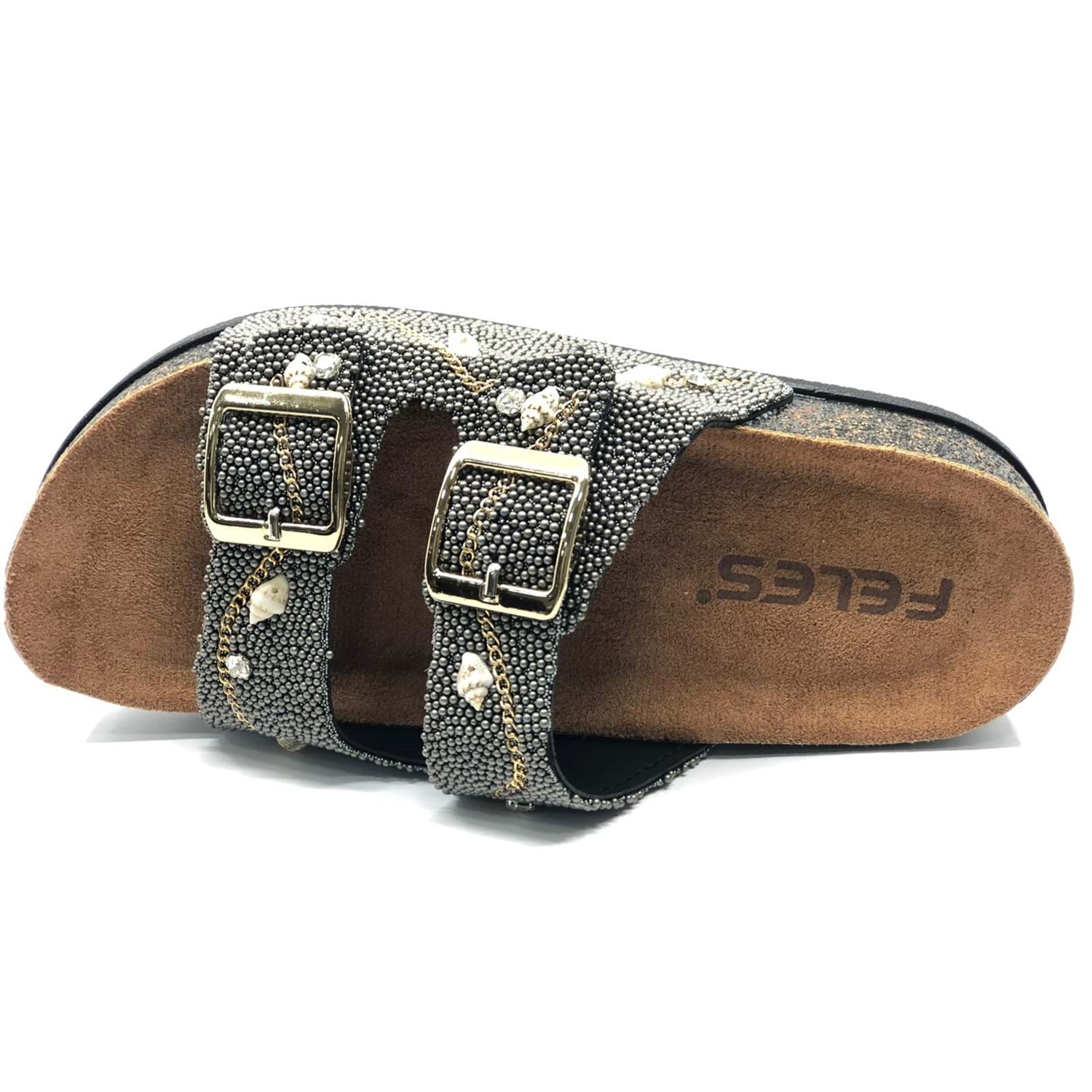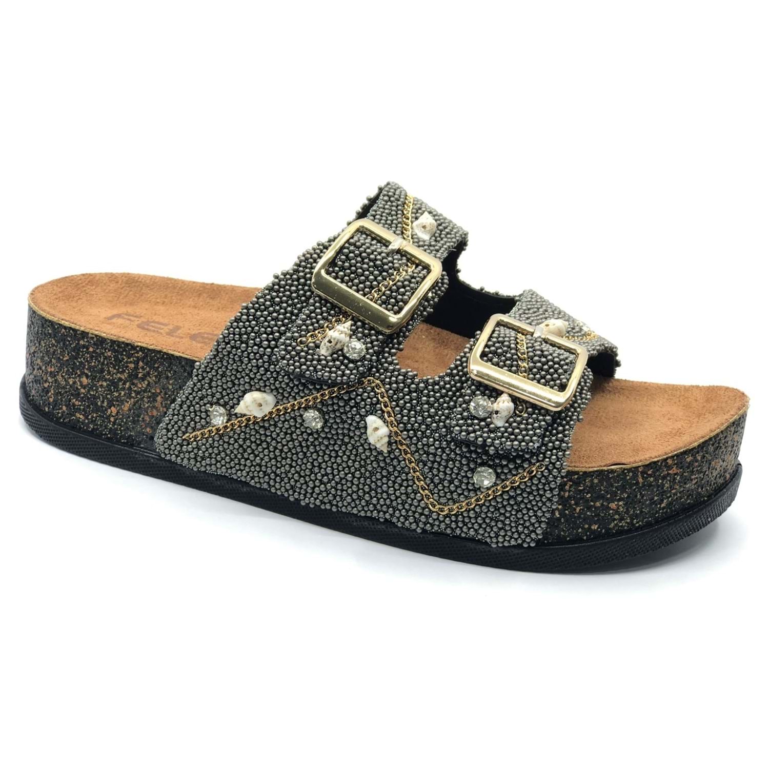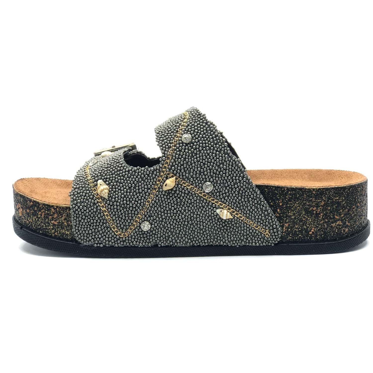 Feles Çift Toka Mantar Taban Taş Detaylı Kadın Terlik